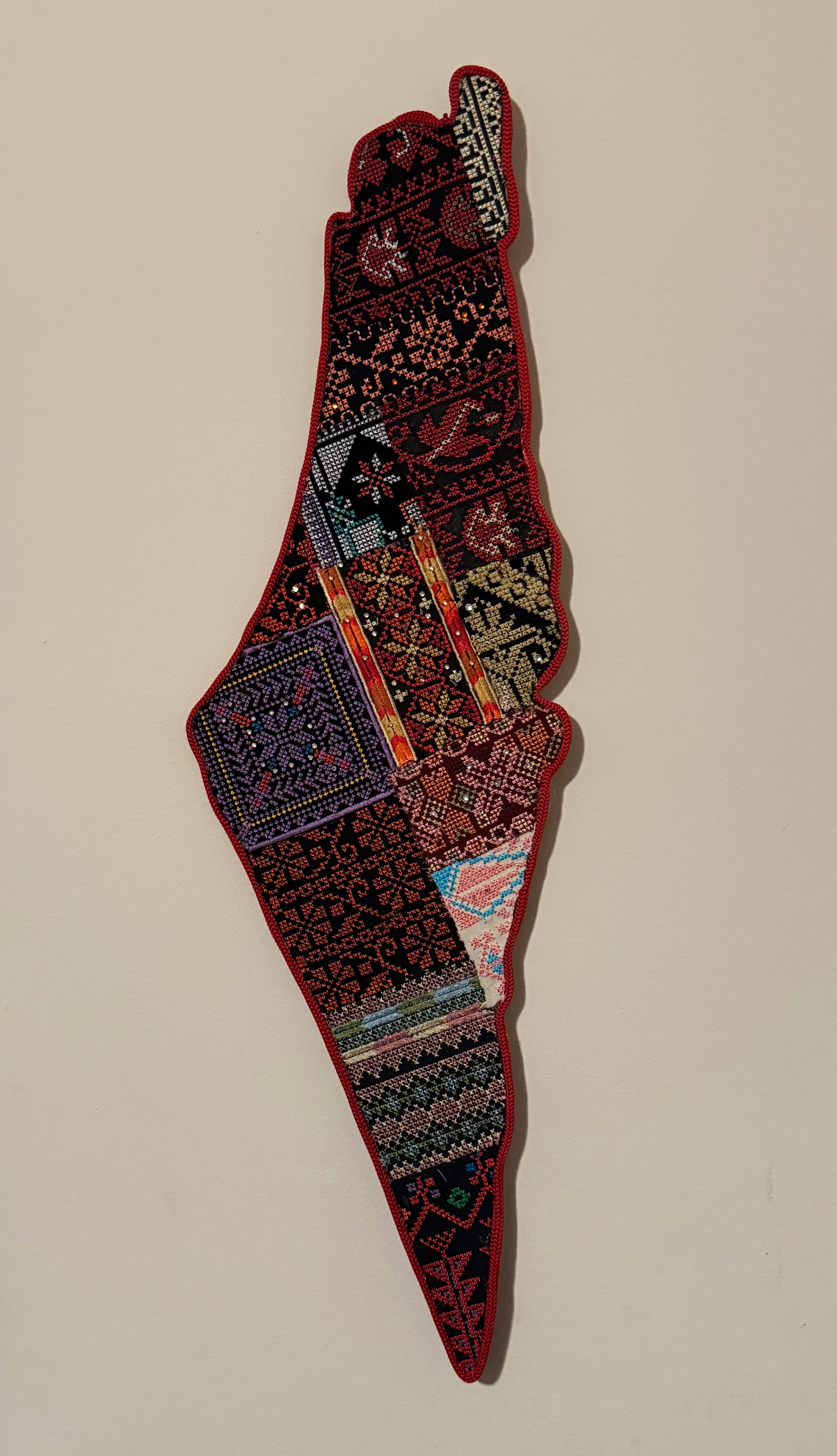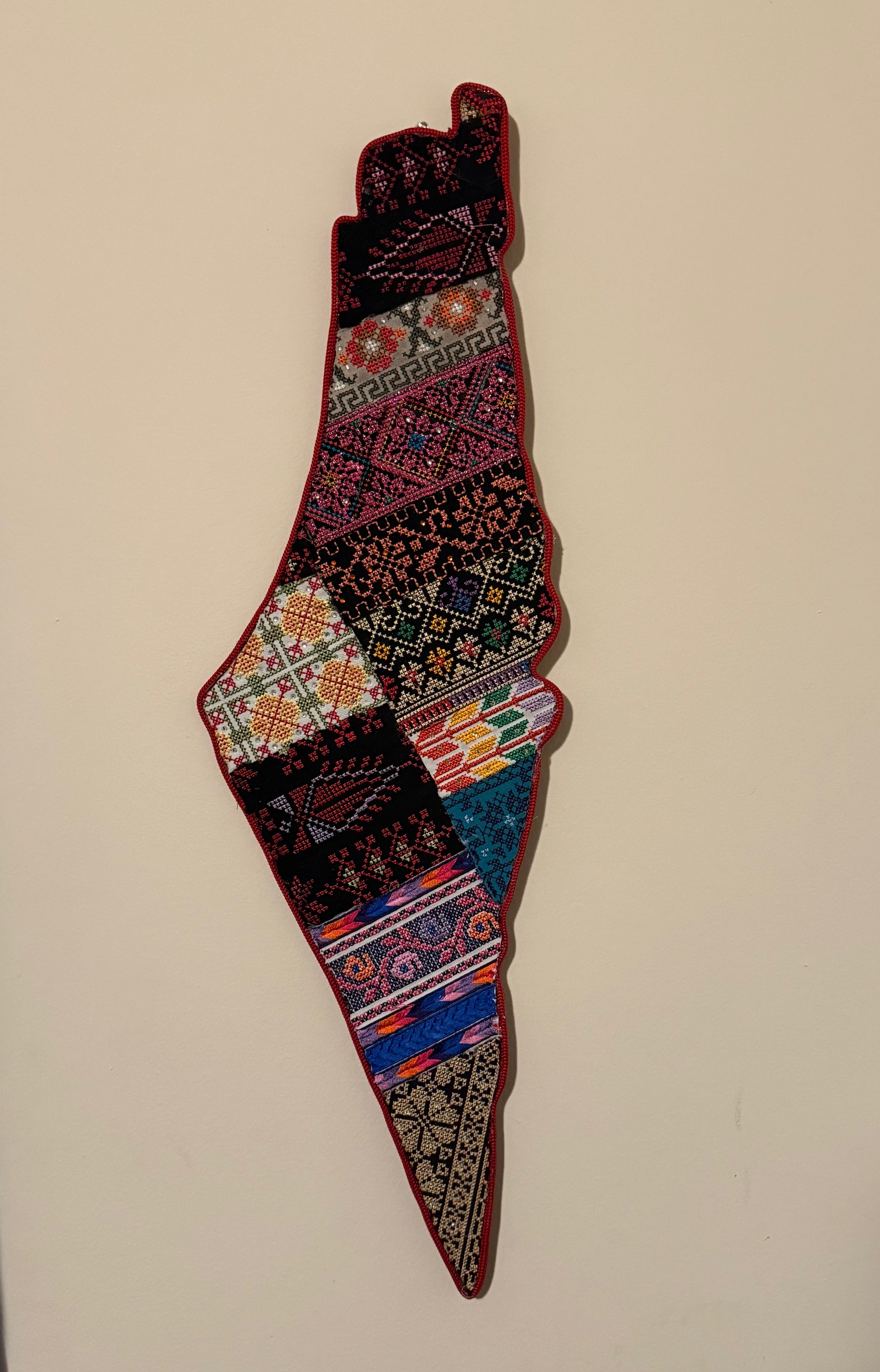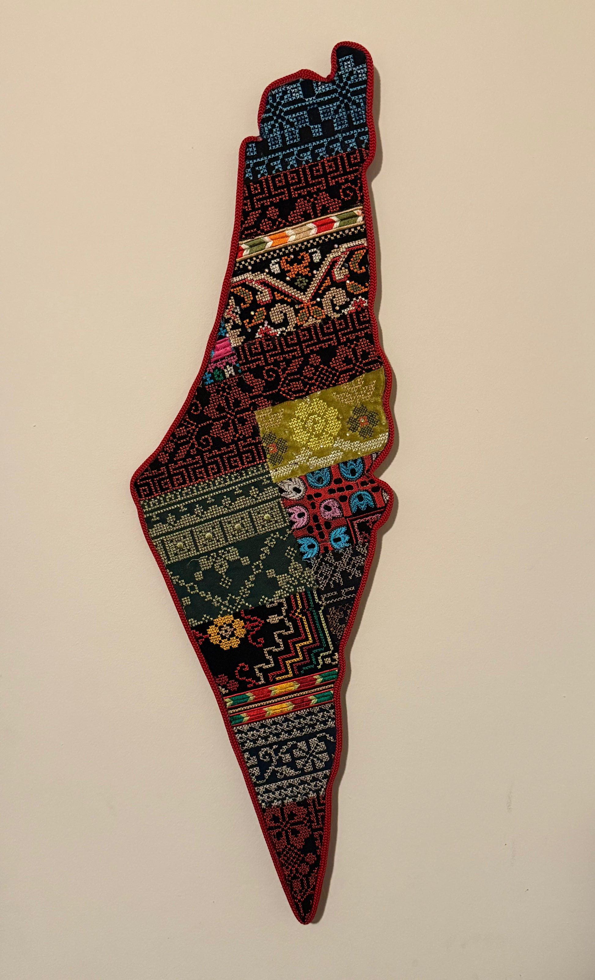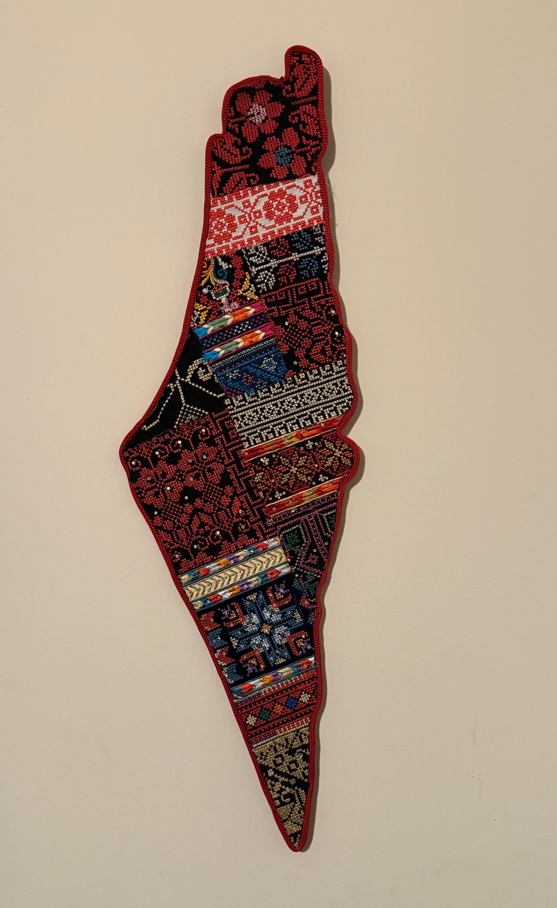 - Embroidered wall hanging decor in the shape of the map of Palestine, decorated with traditional Palestinian tatreez (cross-stitch embroidery) in vibrant beautiful colors.