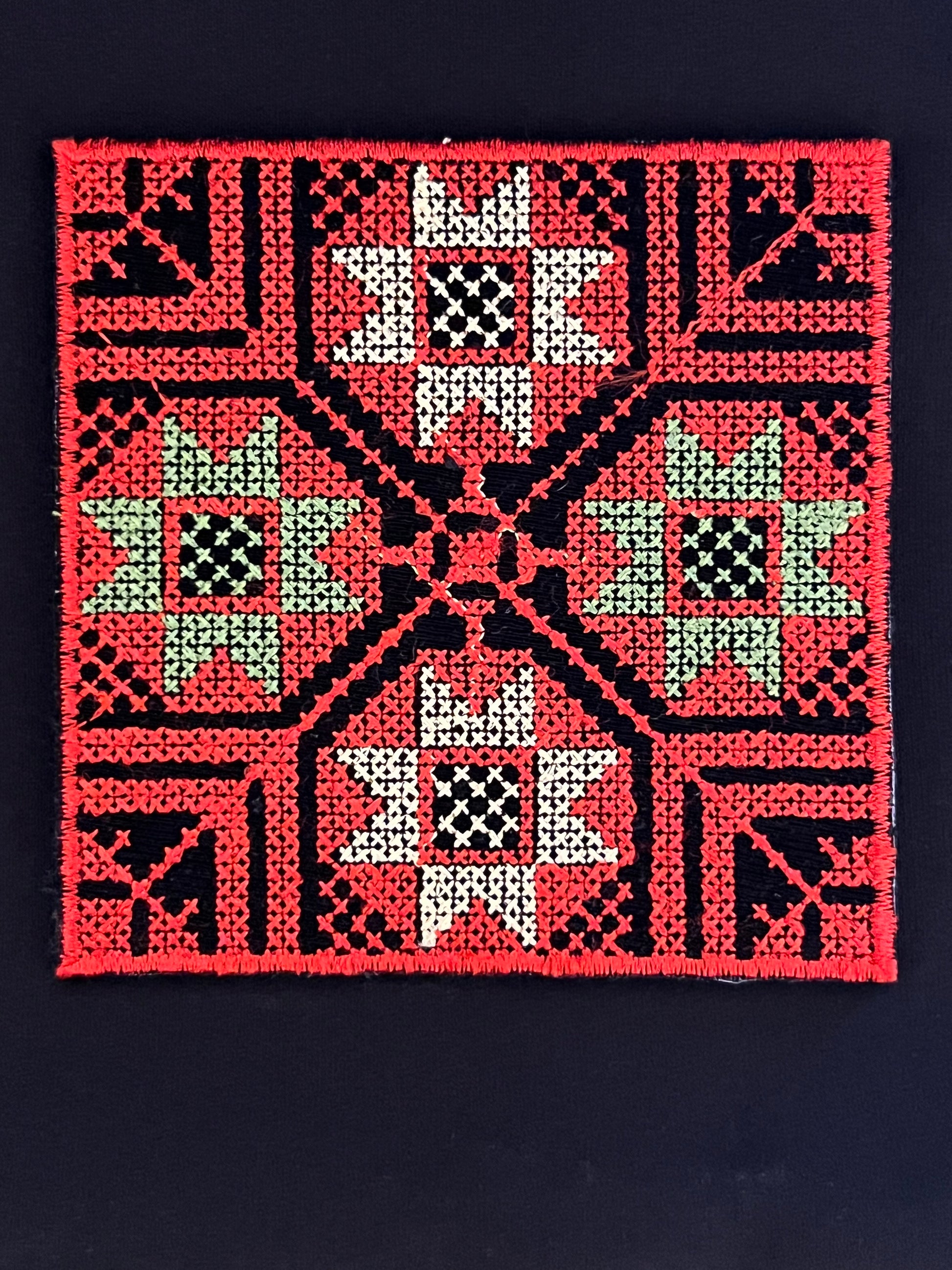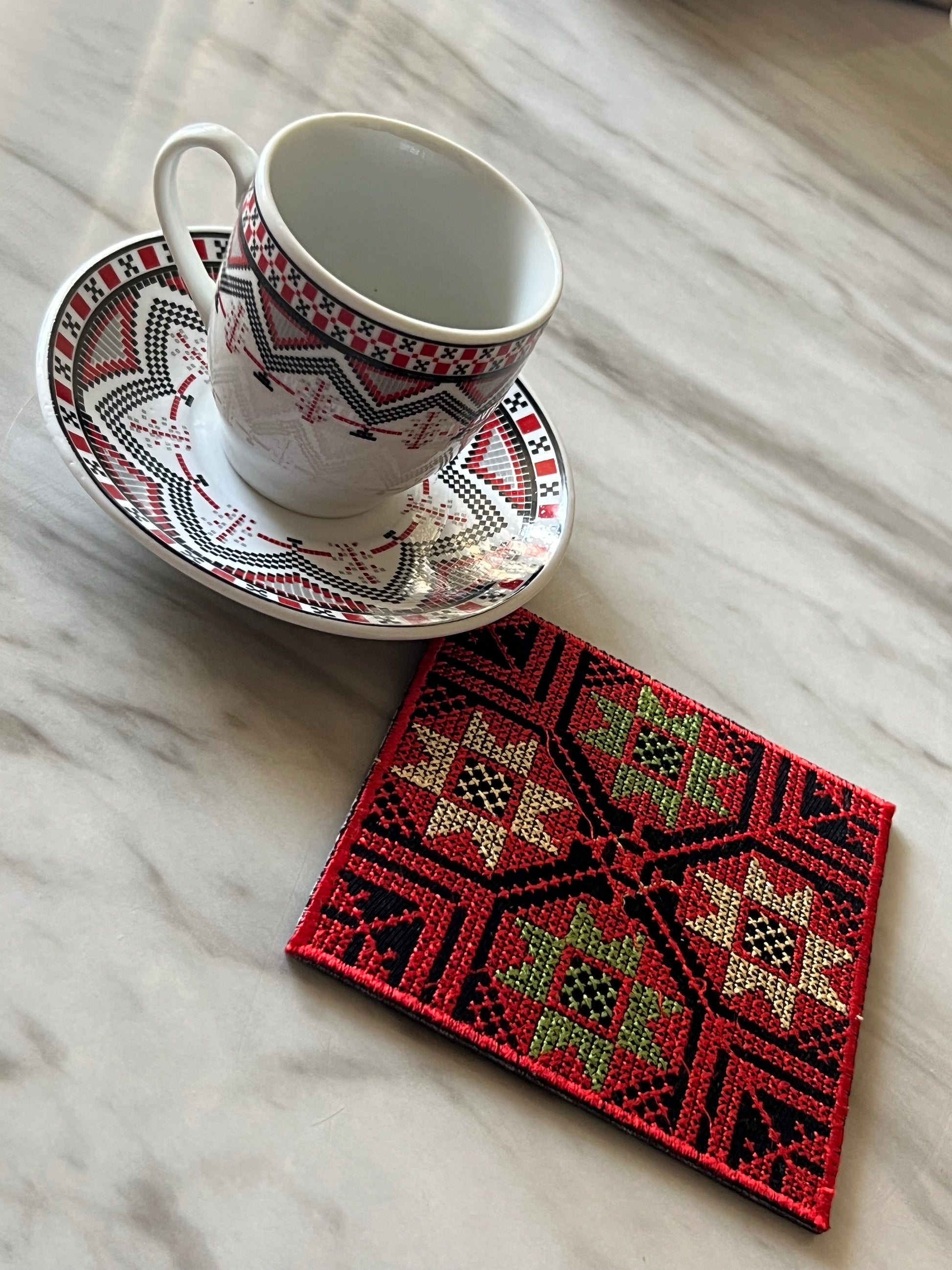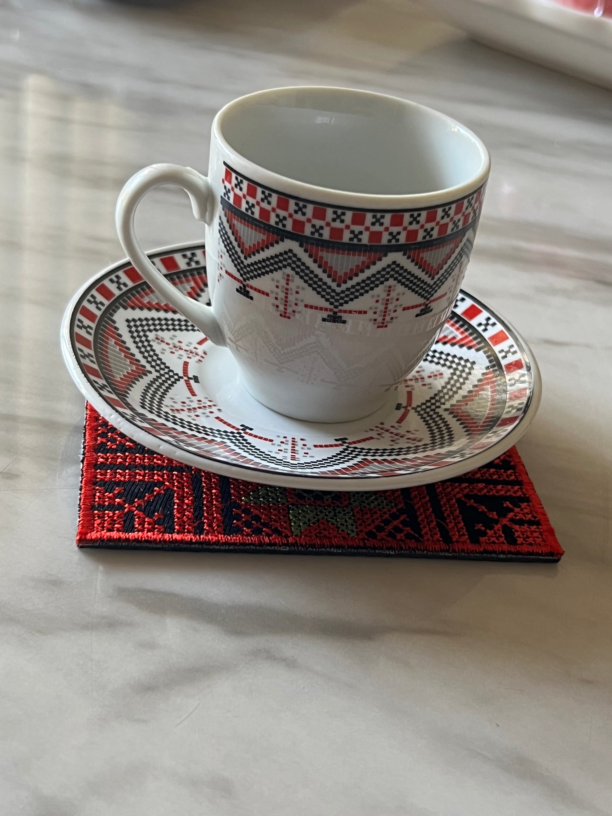 Bring a touch of heritage and elegance to your table with this Palestinian inspired handcrafted Tatreez coaster. Adorned with traditional Palestinian embroidery patterns, each piece carries generations of artistry and storytelling in its stitches. Beyond its cultural significance, the coaster is both beautiful and functional—protecting your surfaces while adding a unique decorative accent. Perfect for daily use or as a thoughtful gift, this coaster blends tradition with modern living.